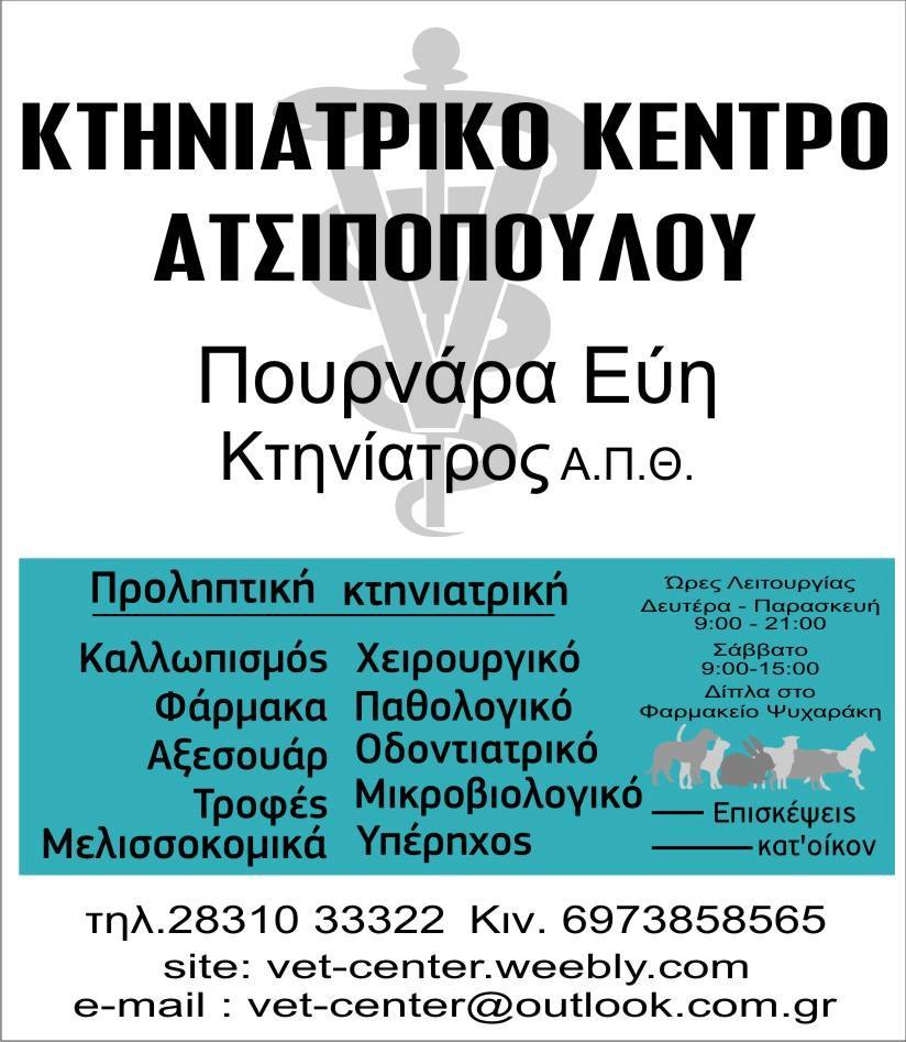Το Κτηνιατρικό Κέντρο Ατσιποπούλου ξεκίνησε τη λειτουργία του τον Ιούλιο του 2014 και βρίσκεται στο Ατσιπόπουλο Ρεθύμνου.Το κτηνιατρείο μας λειτουργεί με κίνητρο την αγάπη για τα ζώα, έχοντας ως βασικό στόχο την διασφάλιση της υγείας τους.
